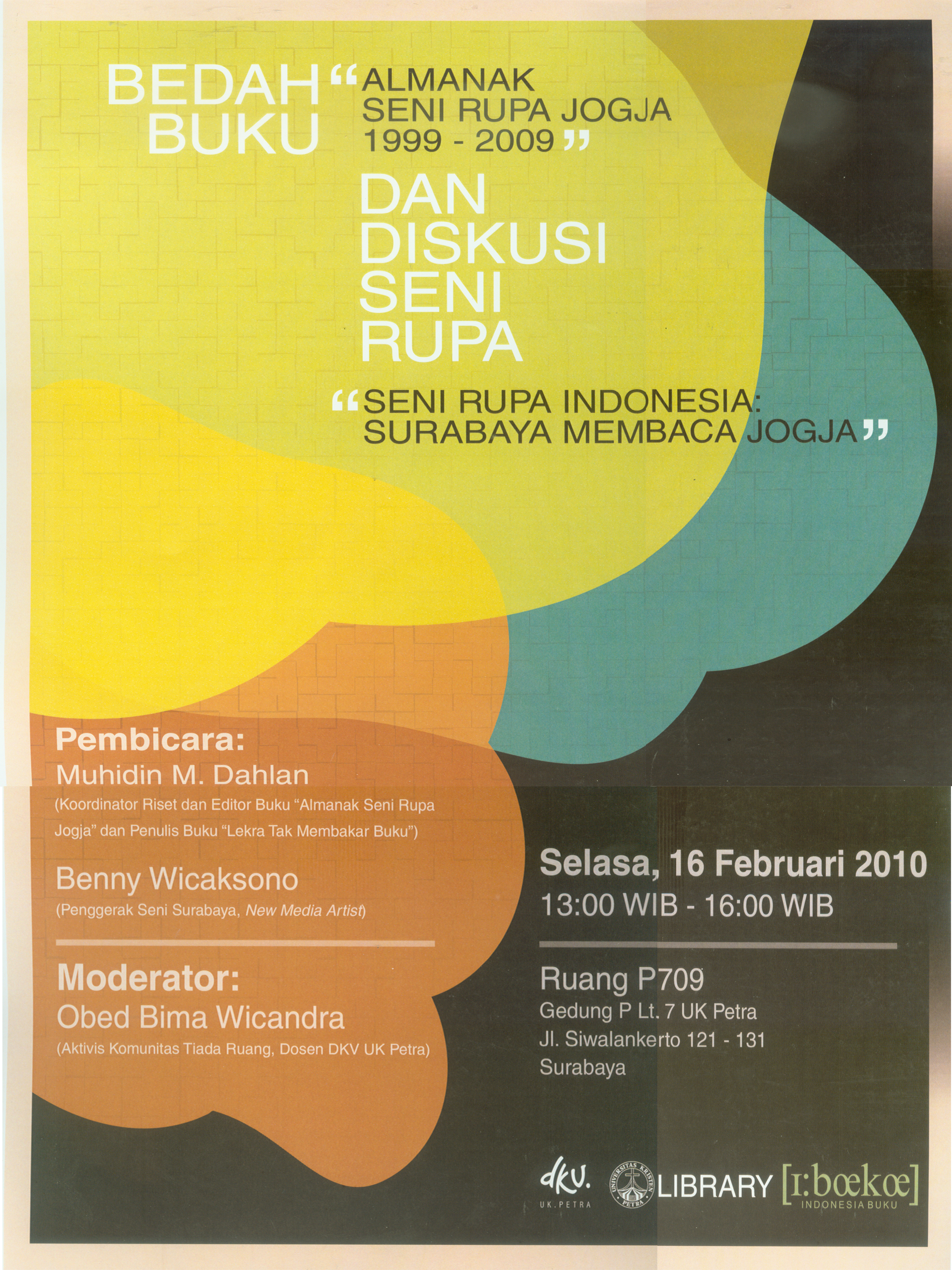 Library's collection Library's IT development CancelBedah buku "Almanak seni rupa Jogja 1999-2009" dan diskusi seni rupa "Seni rupa Indonesia : Surabaya membaca Jogja" diadakan pada hari Selasa, 16 Februari 2010 dengan pembicara Muhidin M. Dahlan dan Benny Wicaksono.