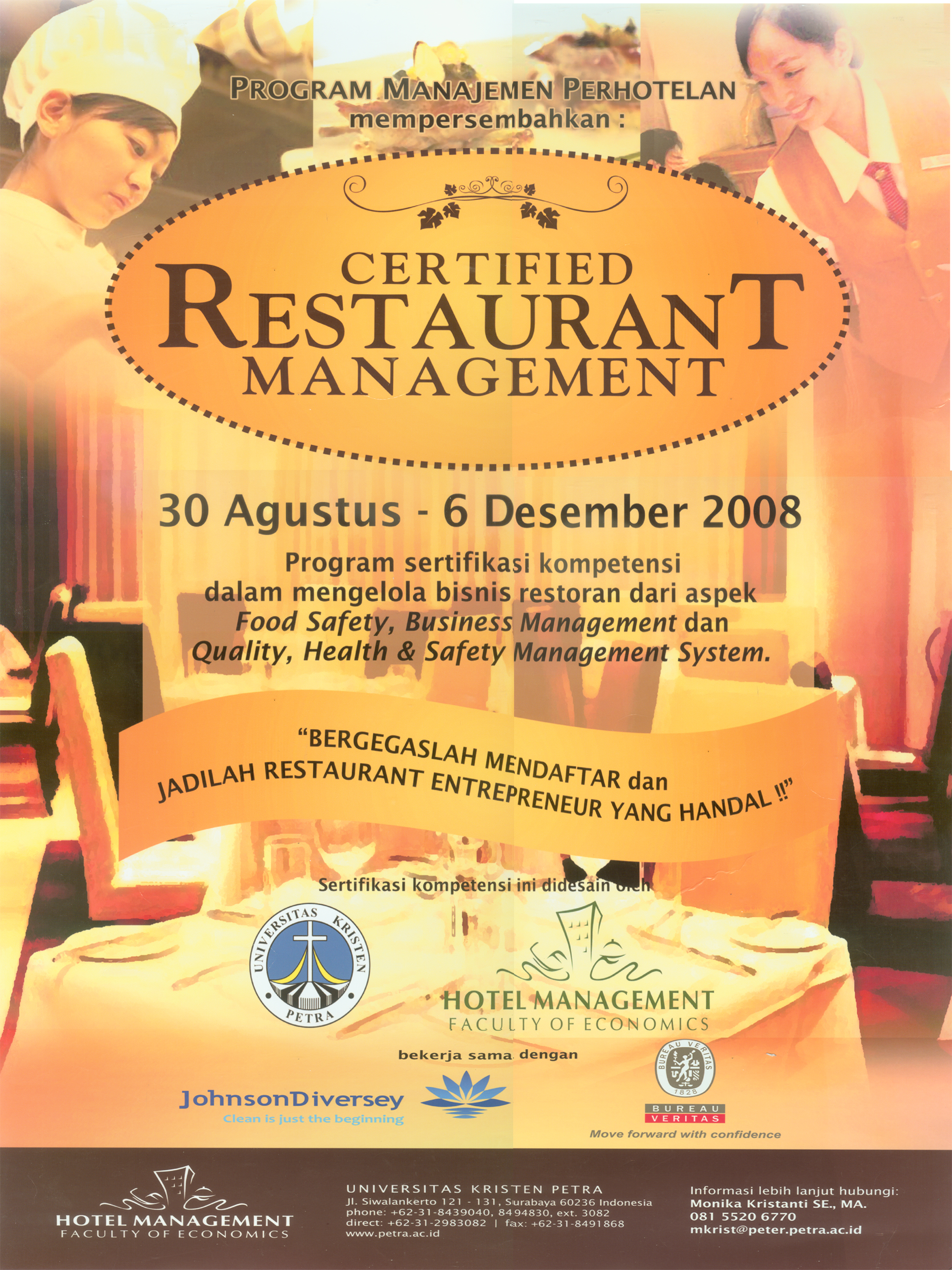 Library's collection Library's IT development CancelCertified Restaurant Management merupakan program sertifikasi kompetensi dalam mengelola bisnis restoran dari aspek food safety, business management dan quality, health & safety management system yang diadakan oleh Program Manajemen Perhotelan Universitas Kristen Petra pada tanggal 30 Agustus hingga 6 Desember 2008.