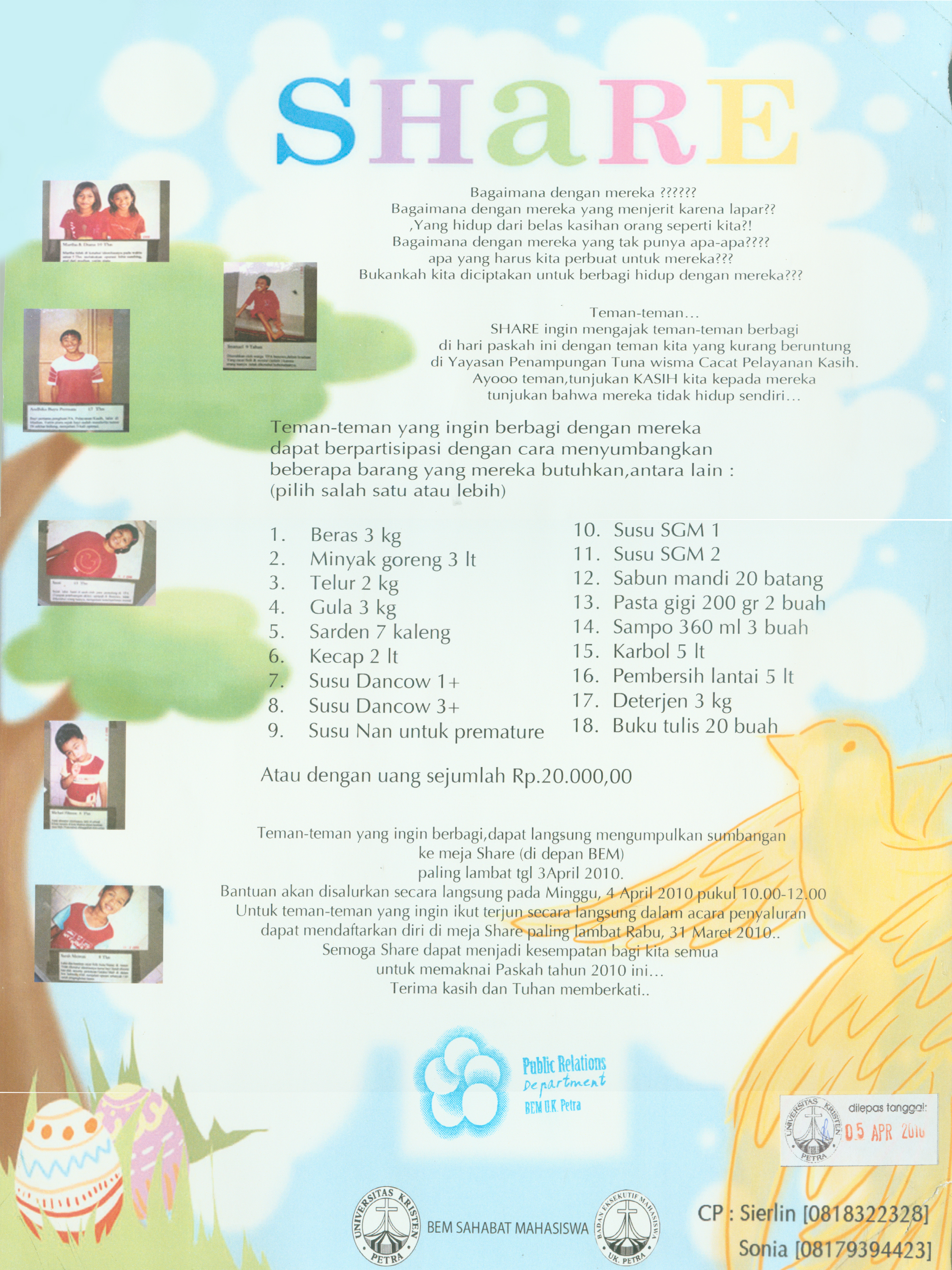 Library's collection Library's IT development CancelDalam rangka menyambut Paskah, Badan Eksekutif Mahasiswa mengadakan kegiatan Share. Sesuai namanya, Share ingin mengajak teman-teman mahasiswa berbagi dengan teman yang kurang beruntung di Yayasan Penampungan Tuna Wisma Cacat Pelayanan Kasih. Bantuan akan disalurkan secara langsung pada hari Minggu, 4 April 2010.