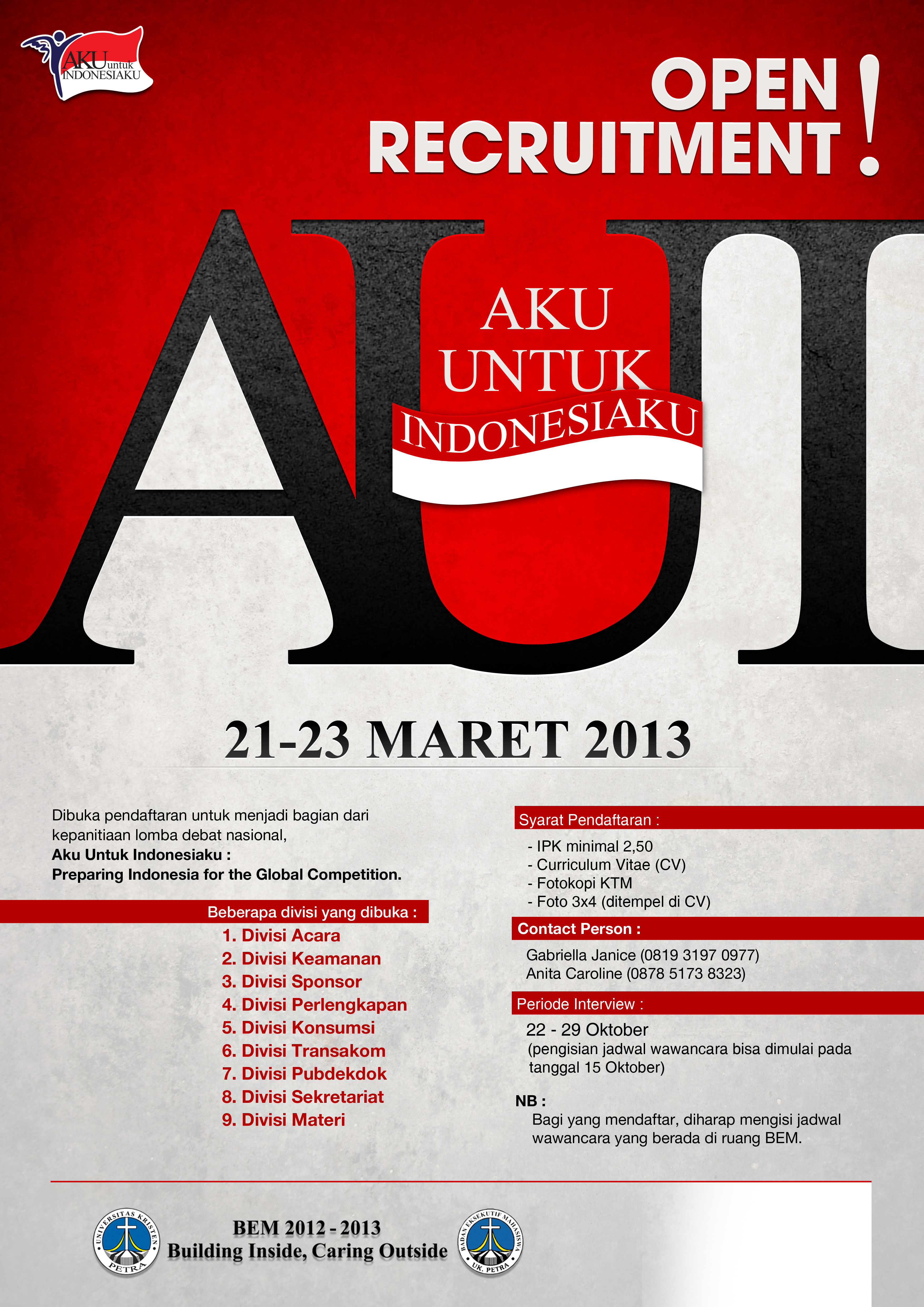 Library's collection Library's IT development CancelPoste rini menginformasikan bahwa telah dibuka pendaftaran untuk menjadi bagian dari kepanitiaan lomba debat nasional, Aku untuk Indonesiaku: Preparing Indoensia for the Global Competition. Pendaftaran dibuka tanggal 22-29 Oktober 2012.