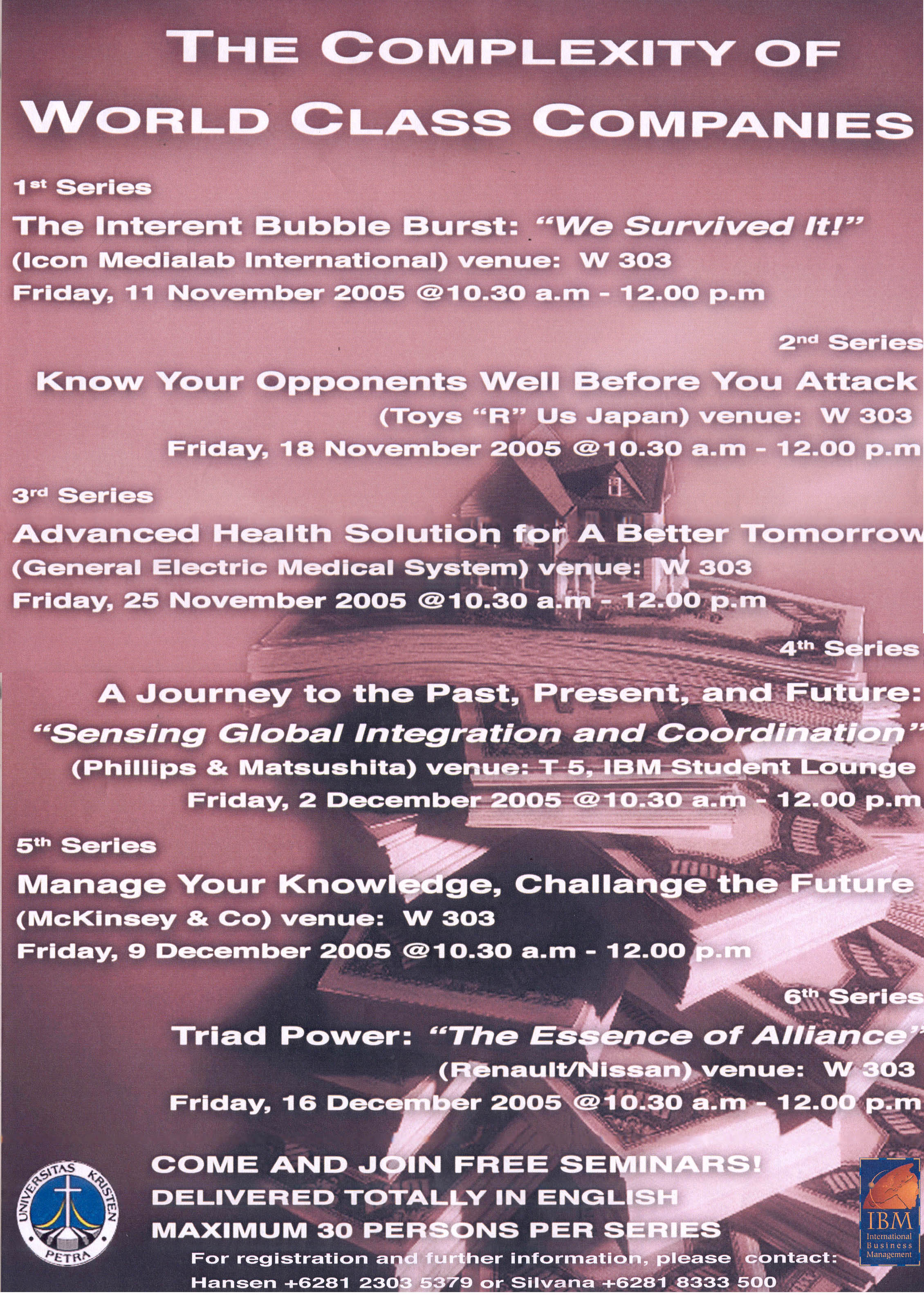Library's collection Library's IT development CancelThis poster give information about sixth series seminars held by International Business Management Program. This seminars held every Friday, start from November 25th until December 16th, 2005. This free seminars delivered totally in English and maximum 30 persons per series.