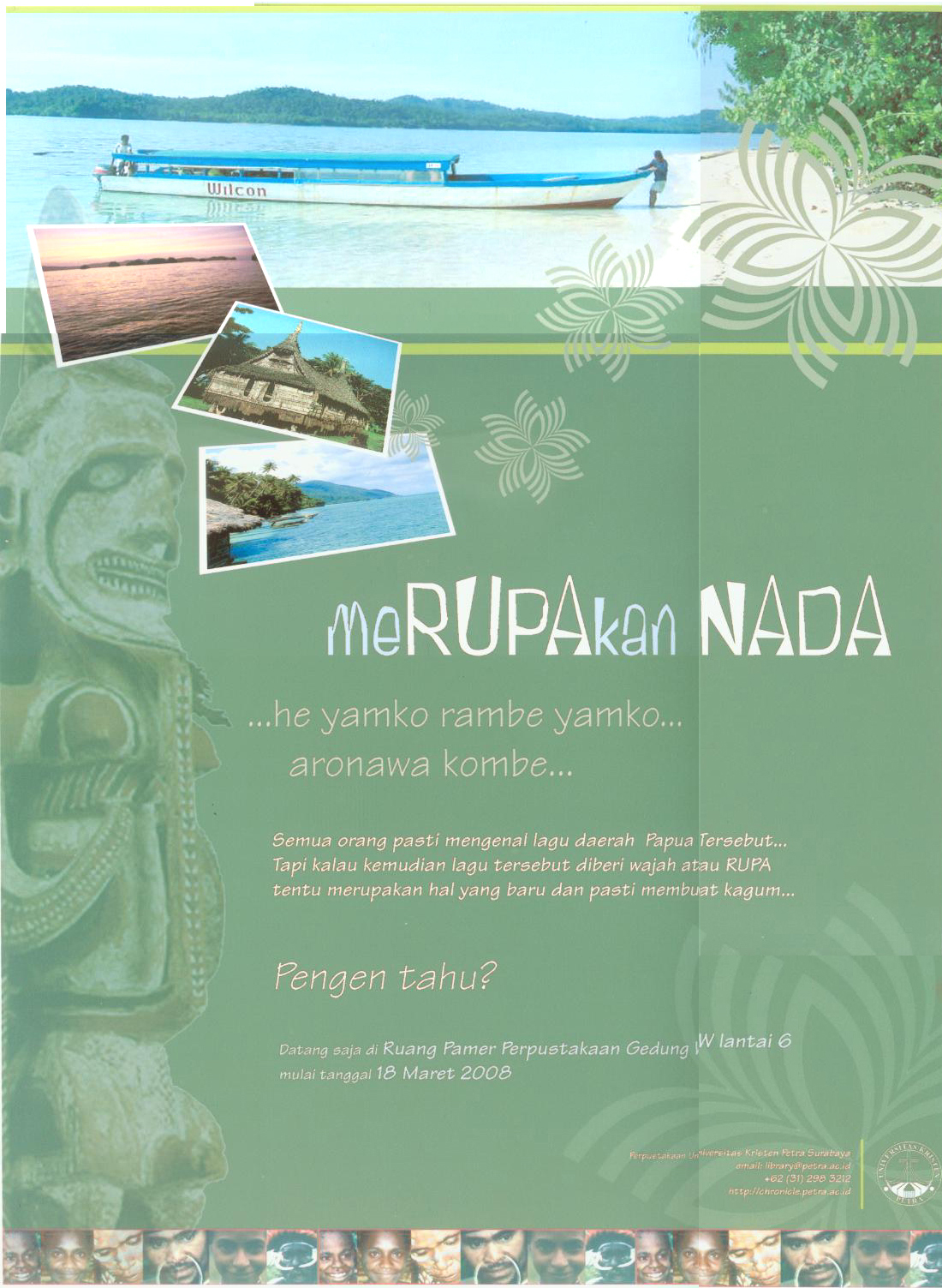 Library's collection Library's IT development CancelPoster ini memberikan pengumuman mengenai tema pameran yang ada di Ruang Pamer Perpustakaan UK Petra, yaitu tentang visualisasi / memberi wajar/ rupa pada sebuah lagu, dalam hal ini lagu daerah Indonesia. Pameran akan dibuka mulai tanggal 18 Maret 2008.